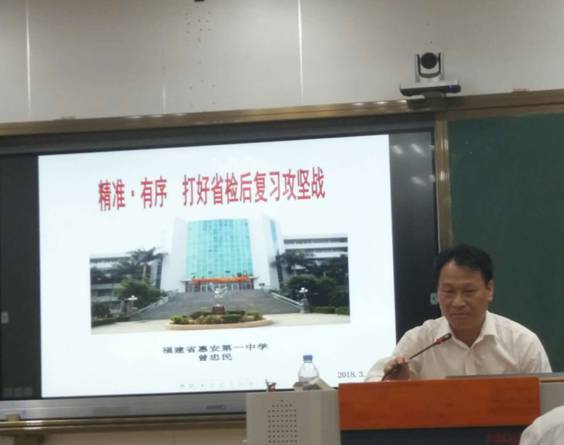 为了更好提高我校政治组的教育教学研究水平,进一步做好高中政治总复习高考备考工作,提高教学实效,我校高中政治教研组特别邀请惠安一中的正高级教师(特级教师)曾忠民老师莅临参加高考总复习专题研讨会,研讨会于18年3月29日下午召开,由政治组组长黄毓景老师主持,高中组全体政治老师参与。