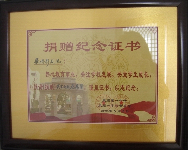 为适应建设先进繁荣的海峡西岸文化名城,解放文化生产力和繁荣文化市场的需要,2008年以来,泉州影剧院在影剧院经理兼书记吴达君校友的带领下,深化内部体制改革,转化经营管理机制,积极探索推进文化事业社会化、市场化、产业化进程,业务拓展与服务水平不断提升,取得明显的社会效益和经济效益下,不忘回报社会,在于今年2月份捐资两万扶贫助学金,近日再向泉州一中捐赠叁万元扶贫助学金。(李玲玲)