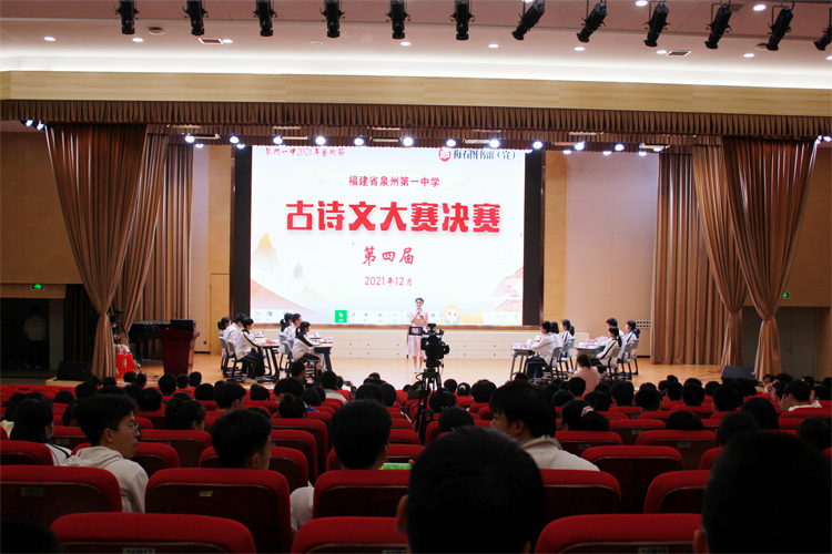 经典诗文润心田,传承风雅又一年。一峰学子竞风采,梅石书生才艺展。千百年来,古诗文始终与我们相依相伴,与我们共赴人生的冷暖四季。为了弘扬中华传统文化,培养学生爱国情操,增强学生文化自信,激发学生学习古诗文的兴趣,让学生养成阅读经典感悟经典的习惯。以“青春心向党 百年颂华章”为主题的2021年“校园文化艺术节”艺术周于2021年12月13日--2021年12月18在学府东海两校区正式举行。作为本次艺术周活动之一的泉州一中第四届“古诗文大赛”决赛活动于12月17日晚藉学府校区陈守仁大礼堂拉开帷幕。