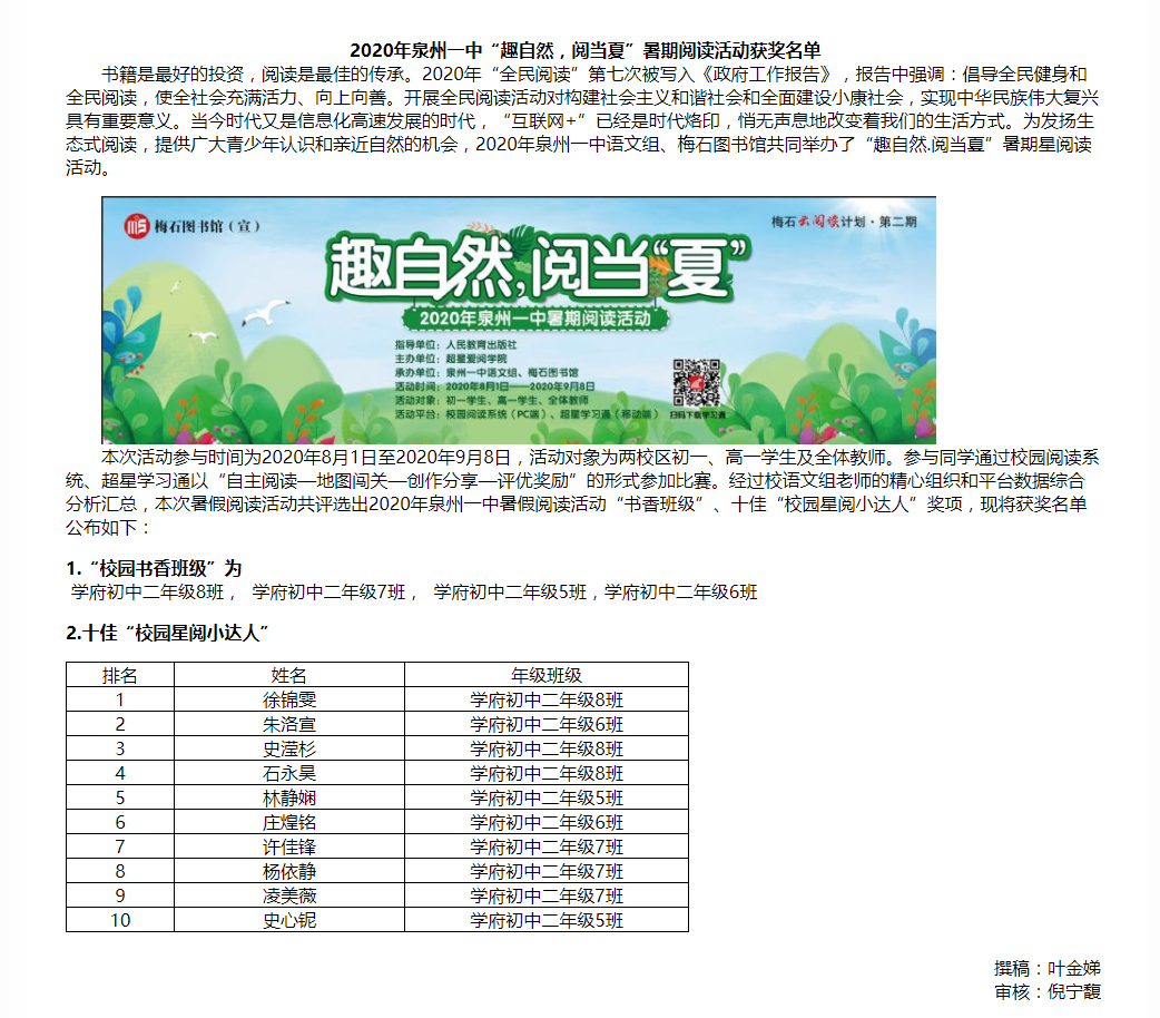 2020年泉州一中“趣自然,阅当夏”暑期阅读活动获奖名单