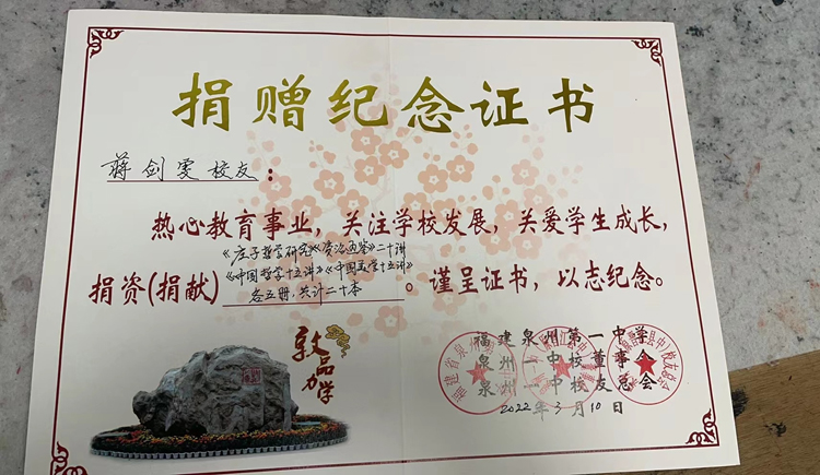 2022年03月,泉州一中88届校友蒋剑雯女士向母校图书馆捐赠《庄子哲学研究》、《资治通鉴》二十讲、《中国哲学十五讲》、《中国美学十五讲》各五册。此套书收藏于学府校区梅石图书馆。