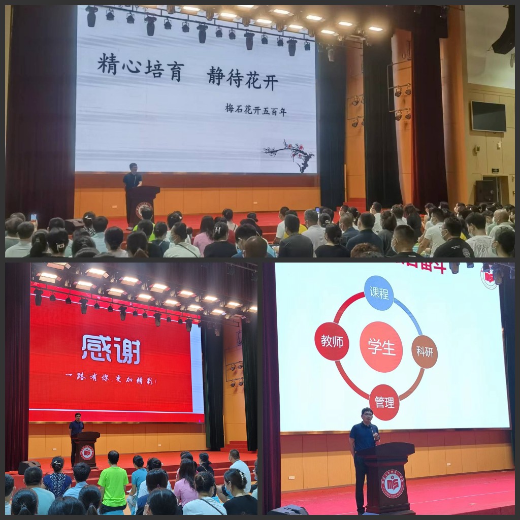 随后,教务处王兴山副主任作了发言。王主任首先谈及泉州一中东海校区的变化,包括整个校区在社会中的认可度越来越高、生源质量不断提升、社会对一中东海校区提出了更高的要求等等。伴随着一中东海校区的变化,一中的师资力量和管理水平也在与时俱进:年段教师大部分为研究生学历且拥有6年以上的教学经验、刚毕业的年段取得的优异成绩、以及年段的常规管理和年段特色建设,如“梅石培优班”,“英才培优活动”、“微走班”等。随后,王主任从科目多、课程容量大、系统性强、学习时间少、成绩波动大、激烈的两级分化等角度分析了小升初的变化,指出学习要从要我学转变为我要学,强调了小升初对于学生学习自主性的要求提高。最后,王主任就新中考情况做了详细说明。